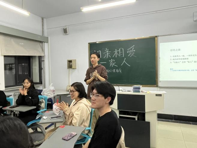 主持人向大家介绍了本次心理团体活动的主题、目标以及时长,并提示同学们放松下来,全身心投入体验。热场环节,主持人引导同学们进行了“一分钟鼓掌”活动,告诉同学们对学习生活应设置符合自己实际情况的的计划并脚踏实地得去落实。在“我知道”的环节,主持人引导同学们分为四组,并根据提示话题进行自我介绍,通过微信群等多种方式互换联系方式,小组成员可以更好地熟识彼此、找寻集体归属感。主持人引导新生进行了多个趣味活动,如“信任之旅”、“你画我猜”、“人椅破冰”等,各组团结一致,增强了凝聚力,也更加信任彼此。收尾环节,主持人引导各组进行“团体树”的绘制并分组进行展示,大家用鲜艳的彩笔装饰小组的树木,以图画表达自己对研究生生活的期待与向往。活动最后,主持人再次提醒大家关注心理健康、积极寻求帮助,并向大家介绍了学校心理咨询的预约流程。此次心理班会在掌声与欢声笑语中结束。